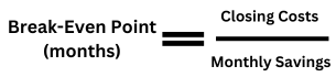 To determine if refinancing is worth it, use the below formula to calculate the break-even point between costs and the monthly savings you’ll get from the refinance. On average, closing costs can cost between 2-5% of the loan amount.